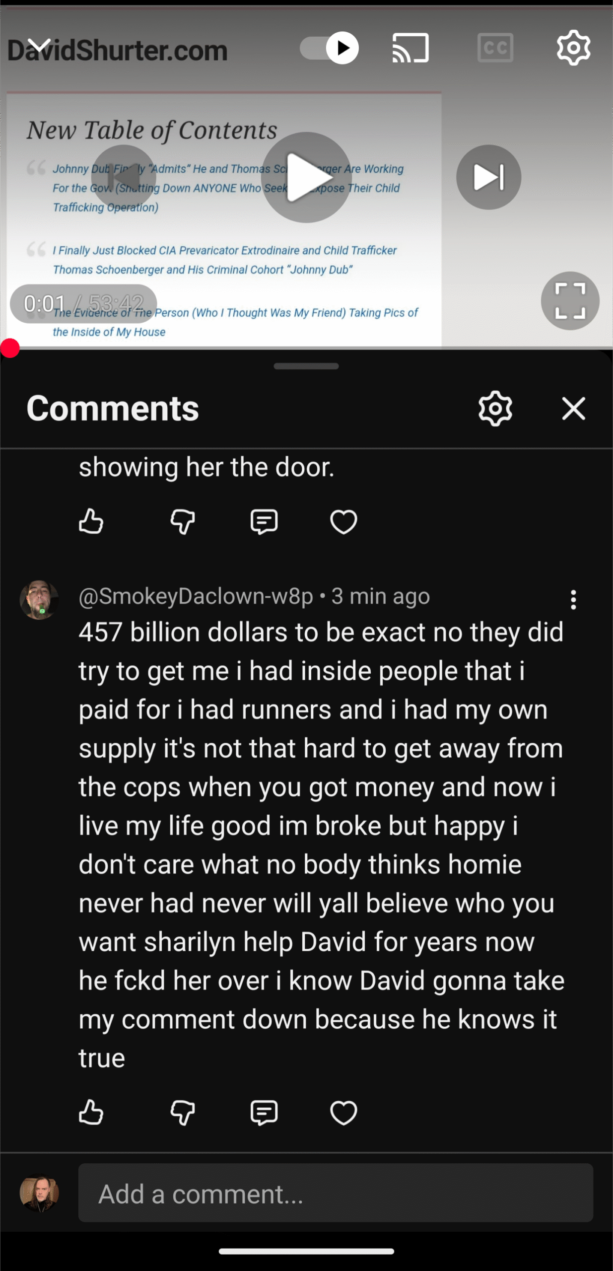 Her urging me to talk to Smokey da Clown (whose first name is Hunter) on the phone brought both Thomas Schoenberger and Gabe Hoffman to try and get my YouTube channel down after Thomas and Smokey got into an altercation in the chat of one of my videos and Thomas and Gabe claimed Smokey was MS13 and was making death threats to them on my YouTube channel.