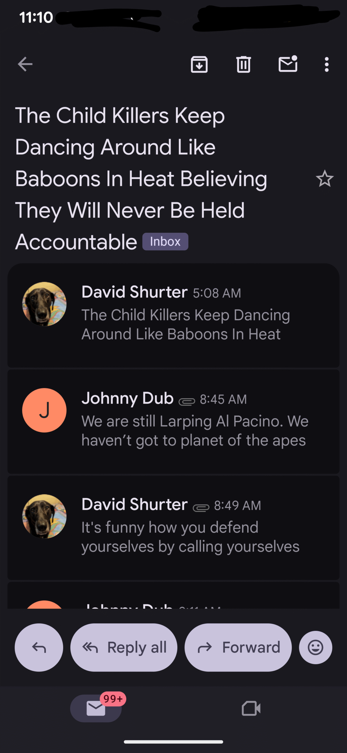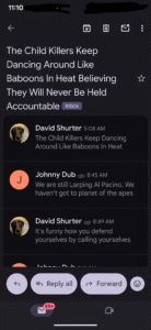 Although I only listened to a few seconds of his message- but the self proclaimed “Internet’s Favorite Predator” seemed all mesmerized with me calling him “lover”. I did so facetiously and with GREAT disgust because THAT is how he addressed me when he sent me his email bragging about killing Owen…