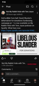 And that’s all I can deal with tonight. I NEVER said Tere Joyce has child porn on her phone any more than I said Thomas Schoenberger had child porn on his phone or computer (and it’s weird they are both claiming I did).