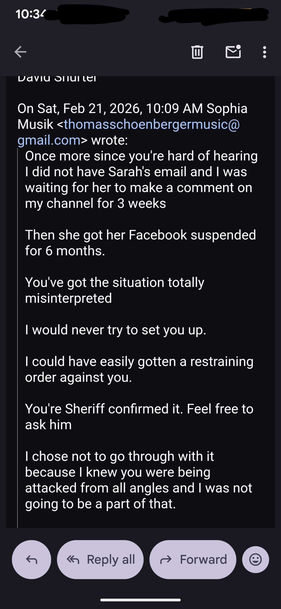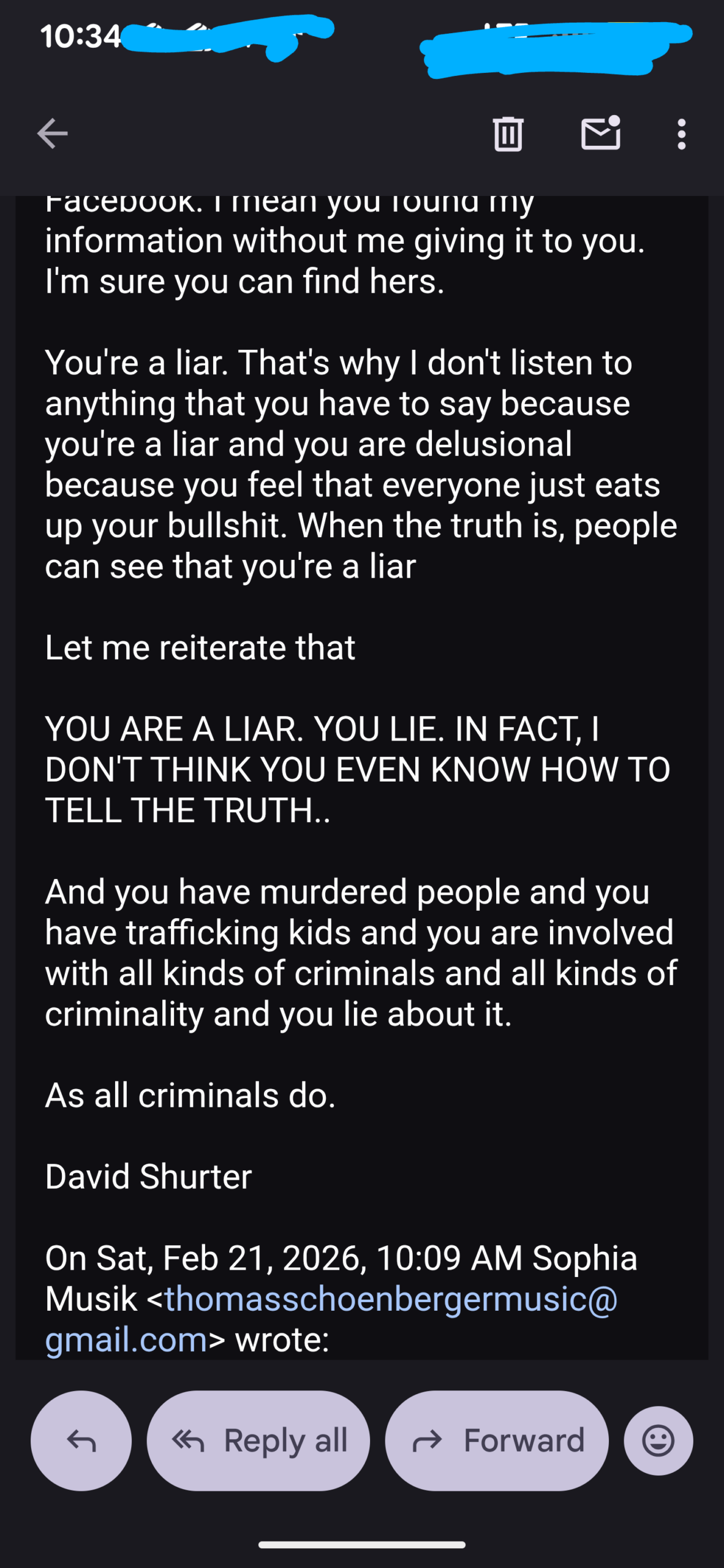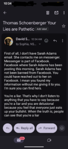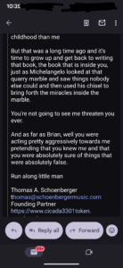Thomas Schoenberger, out of the blue and completely unsolicited, sent me Tere Joyce’s address. THEN he publicly announced that he did so on a YouTube post…