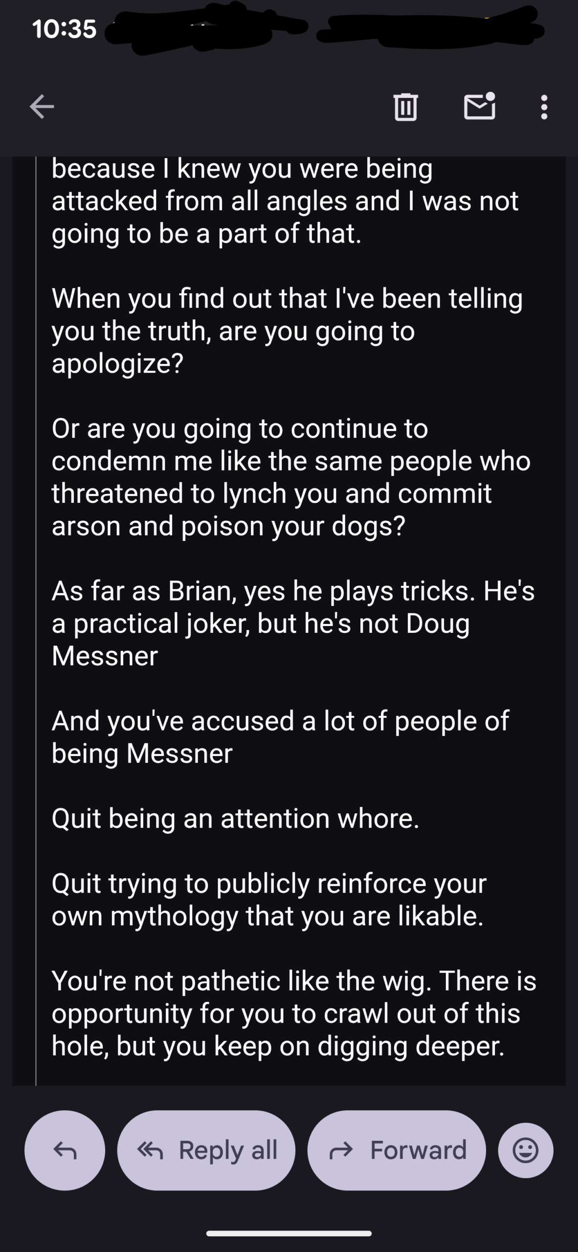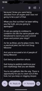 I only listened to a few seconds- but realizing he was bringing up Mark Anderson and Walt Carleson- who I haven’t spoken to since I was 19 (and I’ll be 60 this year), he is deflecting in a way that I didn’t bother to listen too.