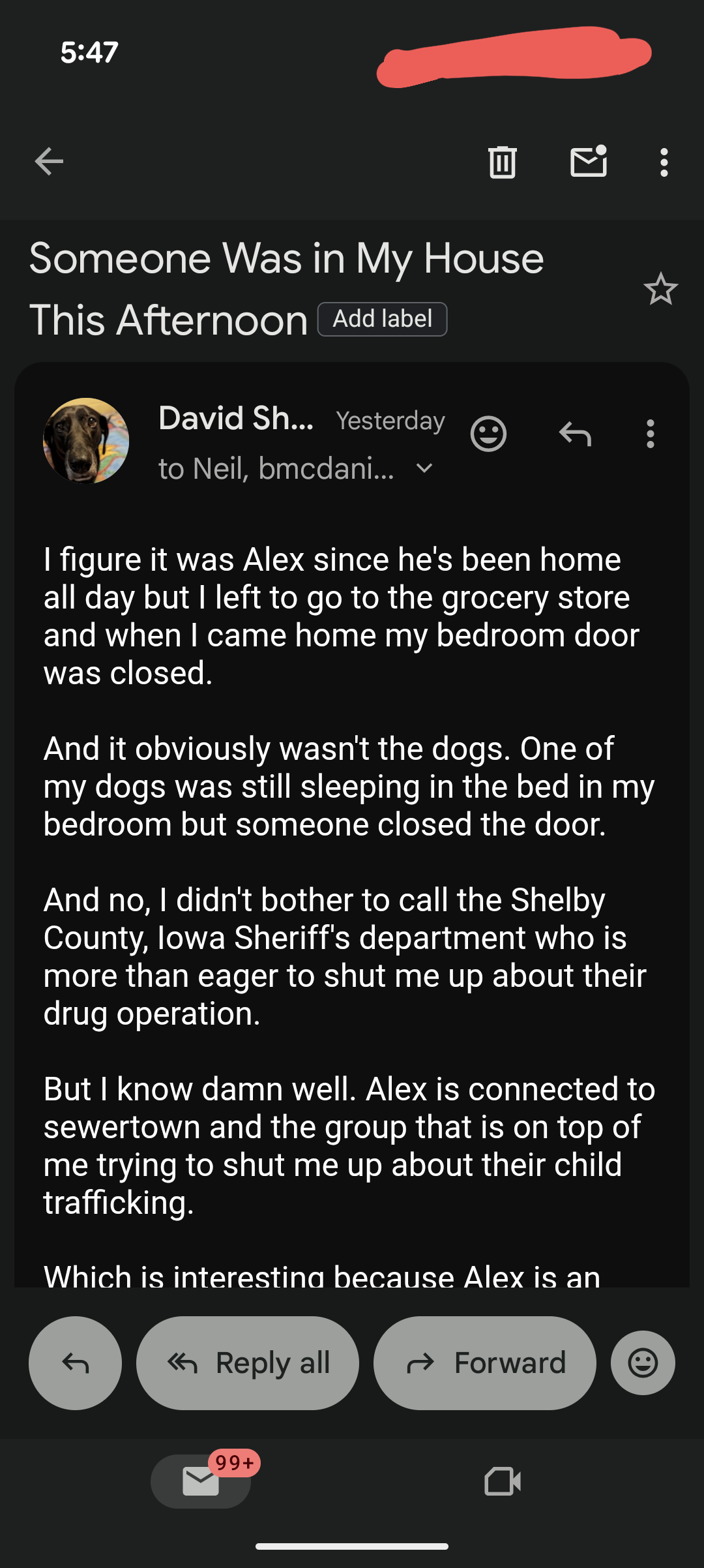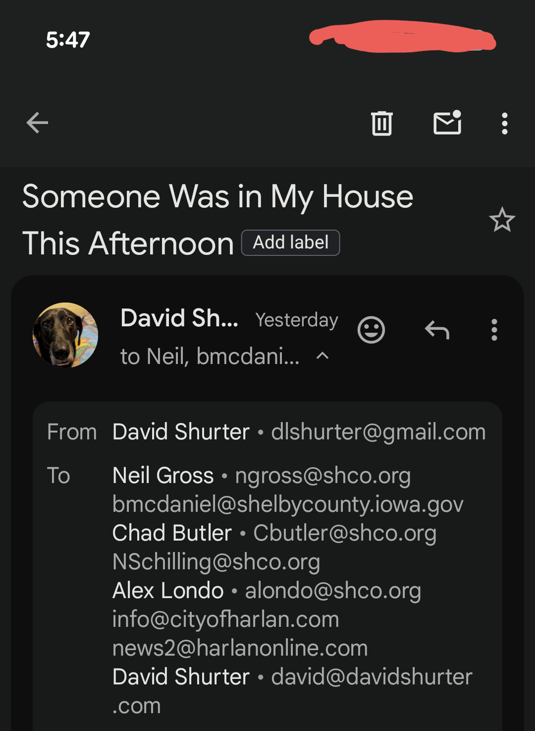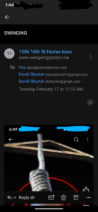 They ALWAYS do crap to let me know- like locking one of my dogs outside in the freezing cold without water thinking I’d be gone all day, or stealing a modem that was on my kitchen table, or stealing a 2005 Dell laptop out of my house and sending me an email bragging about it, etc. etc. etc. all the while this group laughs and says how the Shelby County IA Sheriff’s department works for THEM and is NEVER going to help me.