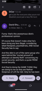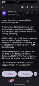 As far as Nathan Stolpman – it seems they are doing the SAME THING TO HIM that they are doing to me. Reportedly he is being harassed by Tere Joyce (@notmyrabbitholewithterejoyce). The hag that is heavily involved with Sewertown, was primary along with Daniel Doud and Geo Farnsworth (not his real last name) bragging about how I was going to “lose my disability” at the SAME TIME Social Sectrild me there had been “a myriad amount of attempts of identity theft” concerning my SSI.