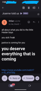 And AGAIN- this BS about the Hester’s -my stepmother Joanne C. Shurter will say whatever she can to deflect away from the fact I’ve been trying to get her investigated for a LONG time now for being involved with murdering people- ESP little boys, with my dad when he was alive.