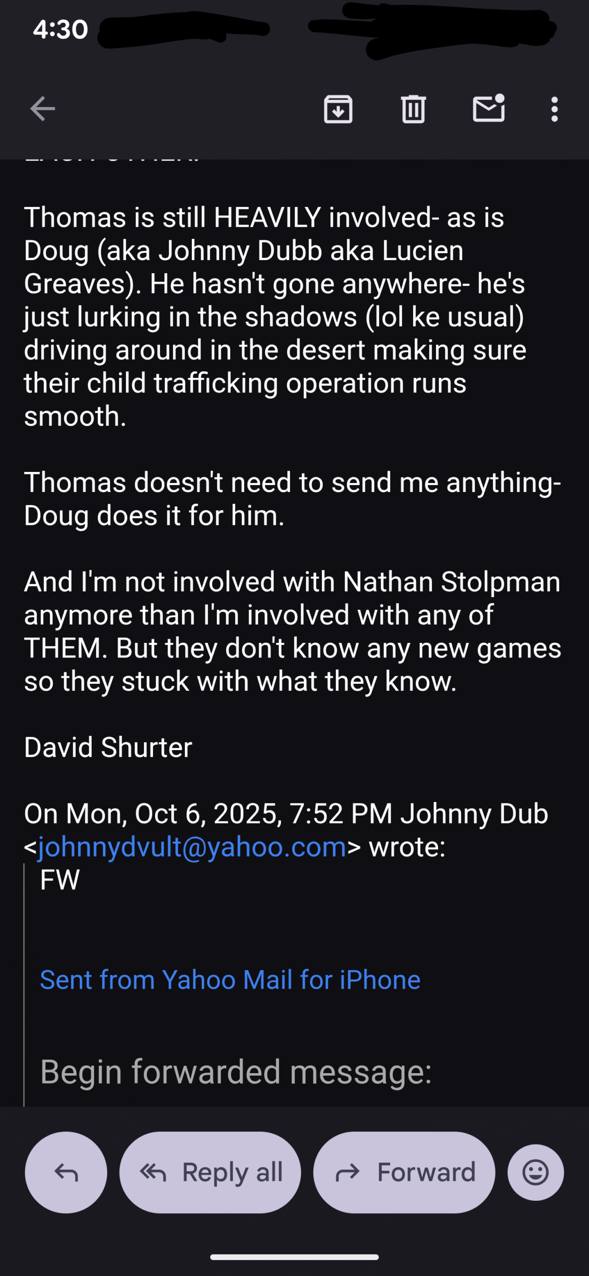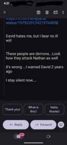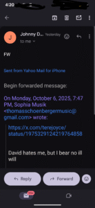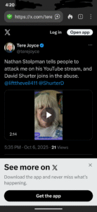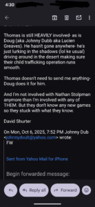 But Tere Joyce posts crap, Thomas Schoenberger sends it to Doug Mesner aka Lucien Greaves, who then forwards it to me. It’s a “passive” gang stalking technique.