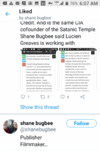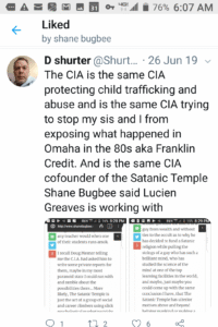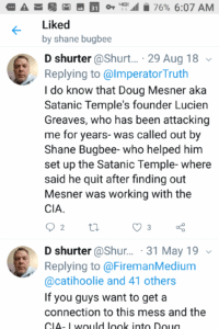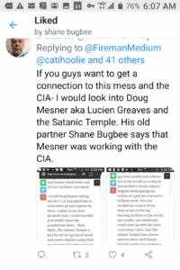 Doug Mesner aka Lucien Greaves founder of the Satanic Temple wasn’t called out by his co founder of the Satanic Temple Shane Bugbee for working with Mossad. He was called out for working with the CIA.