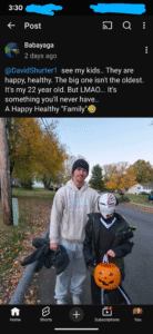 1). A picture of Geo’s kids at Halloween in NO WAY NEGATES the fact Geo bragged, along with Daniel Doud, of coming into my area and murdering my friend Owen…