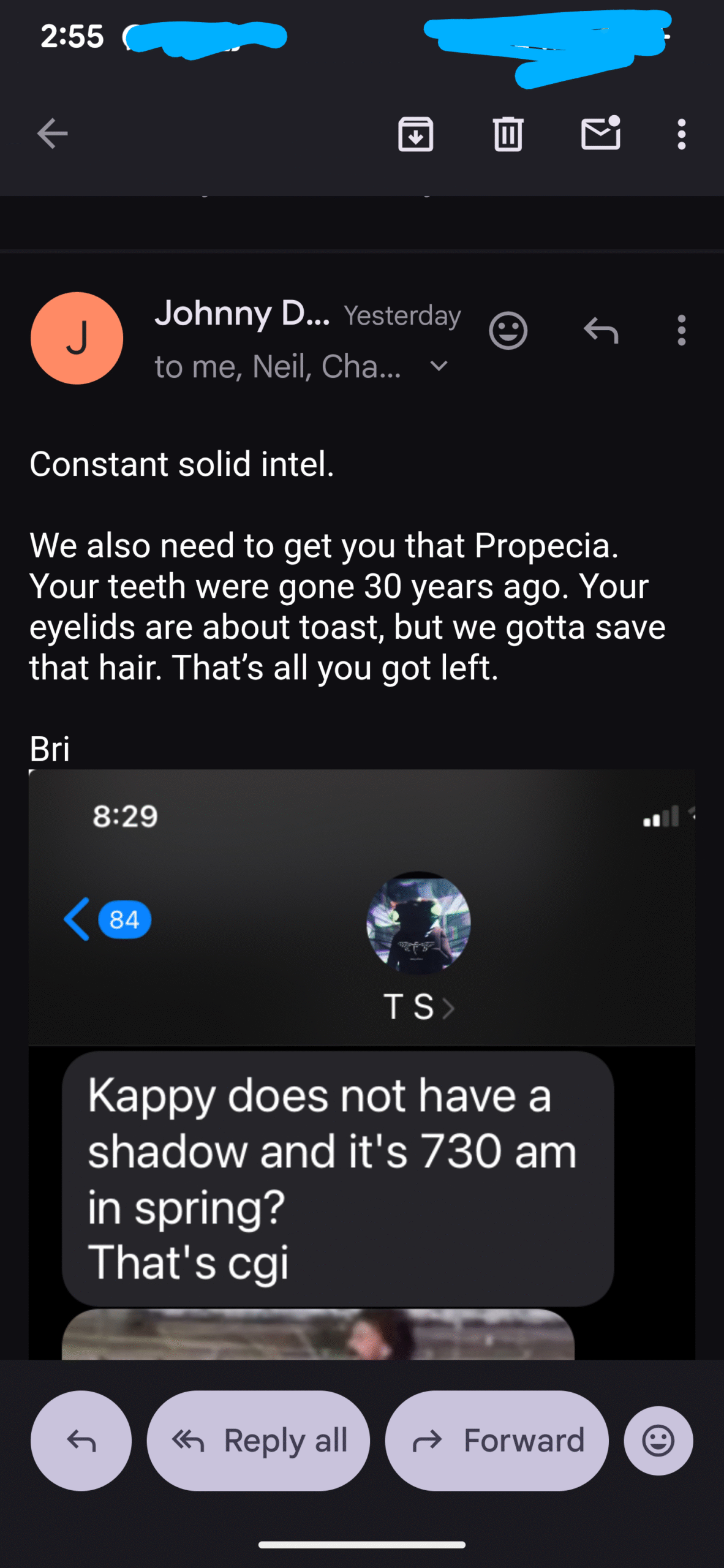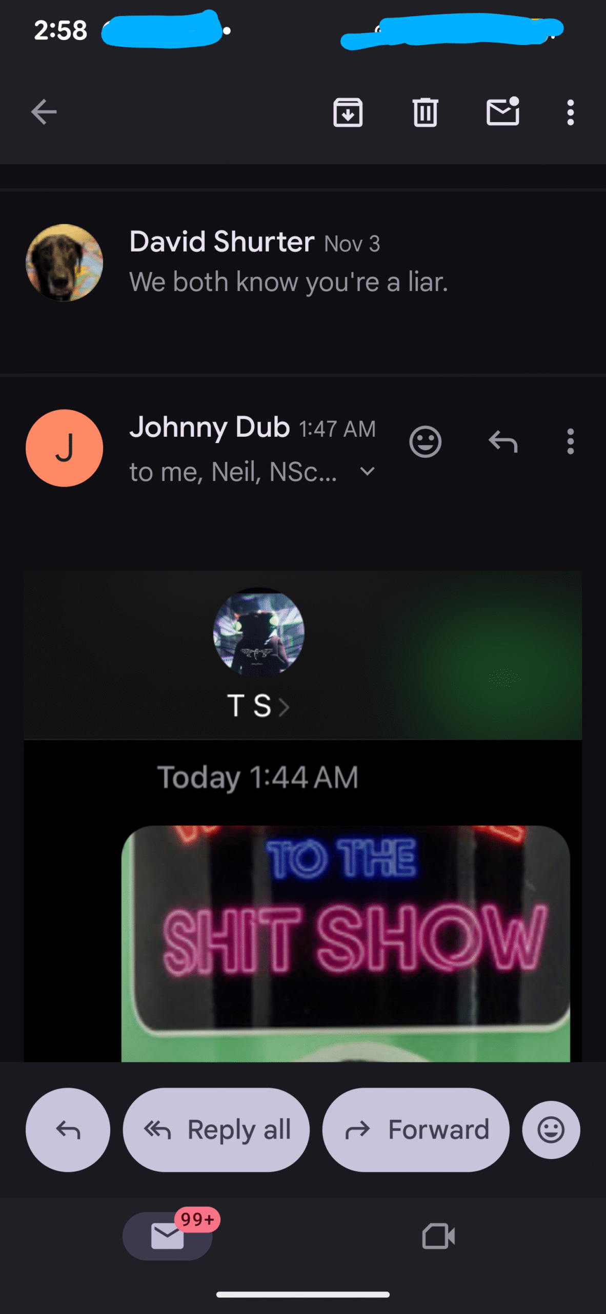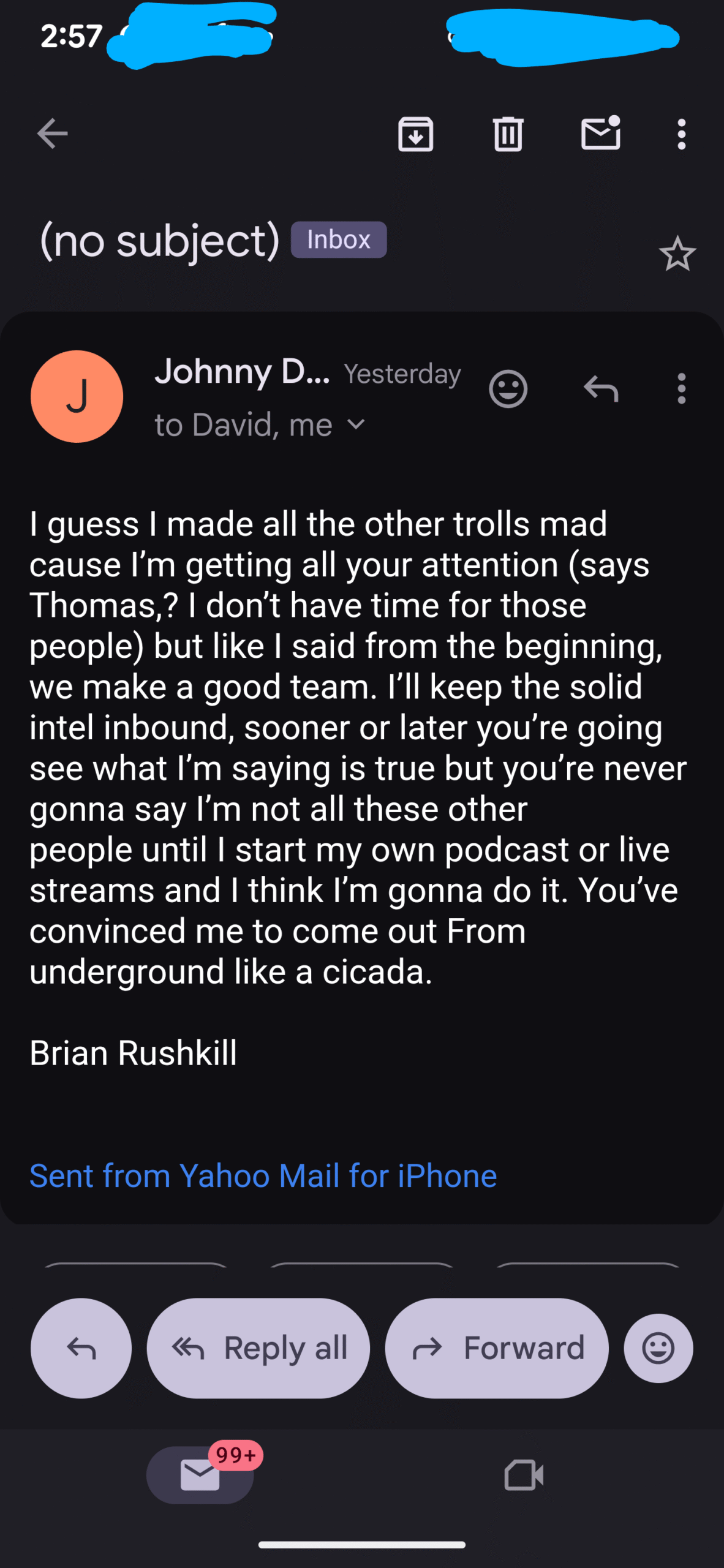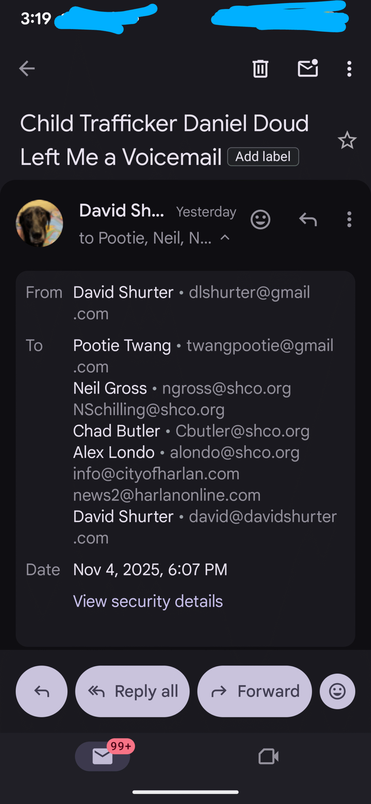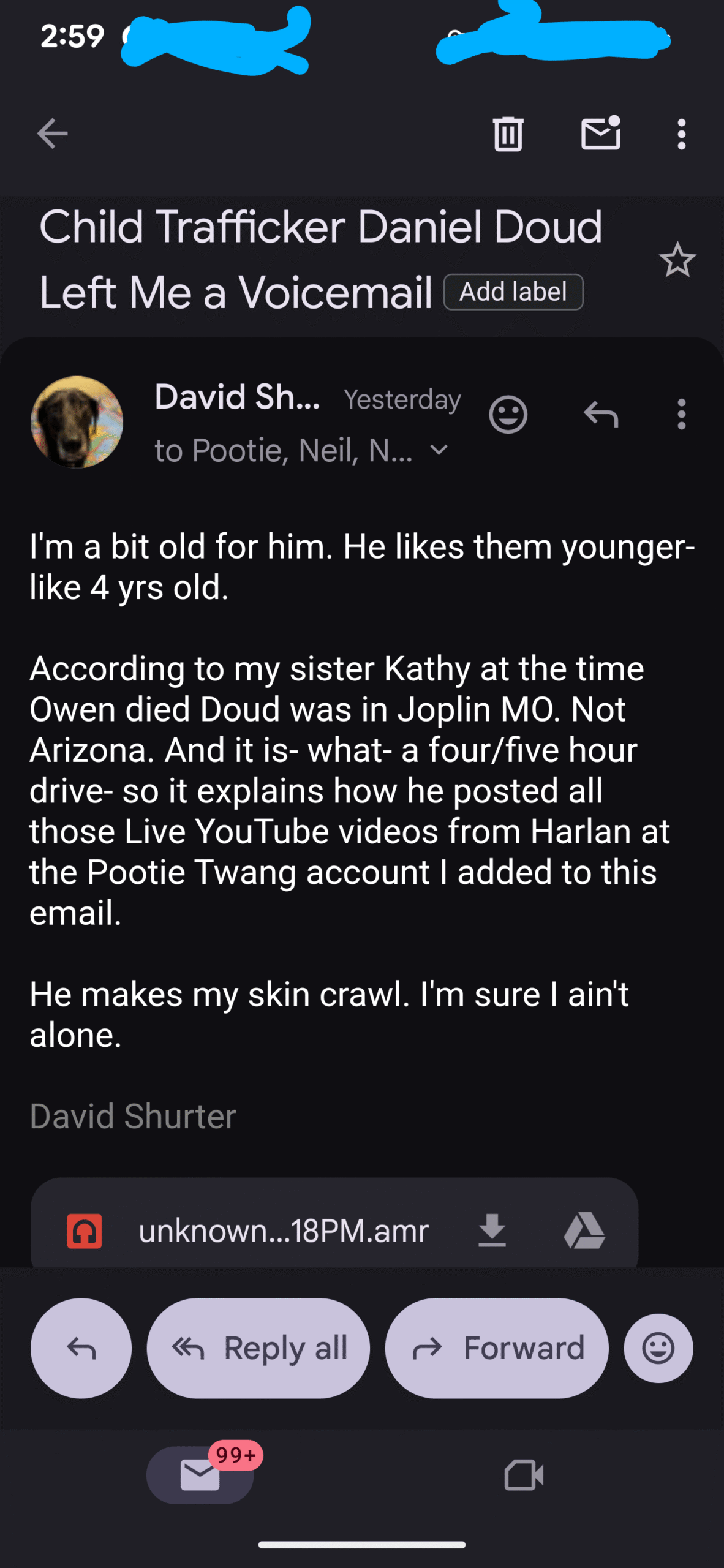 First, yesterday I realized Daniel Doud had called me on Monday from an blocked number and left me a voicemail so I sent it to police…