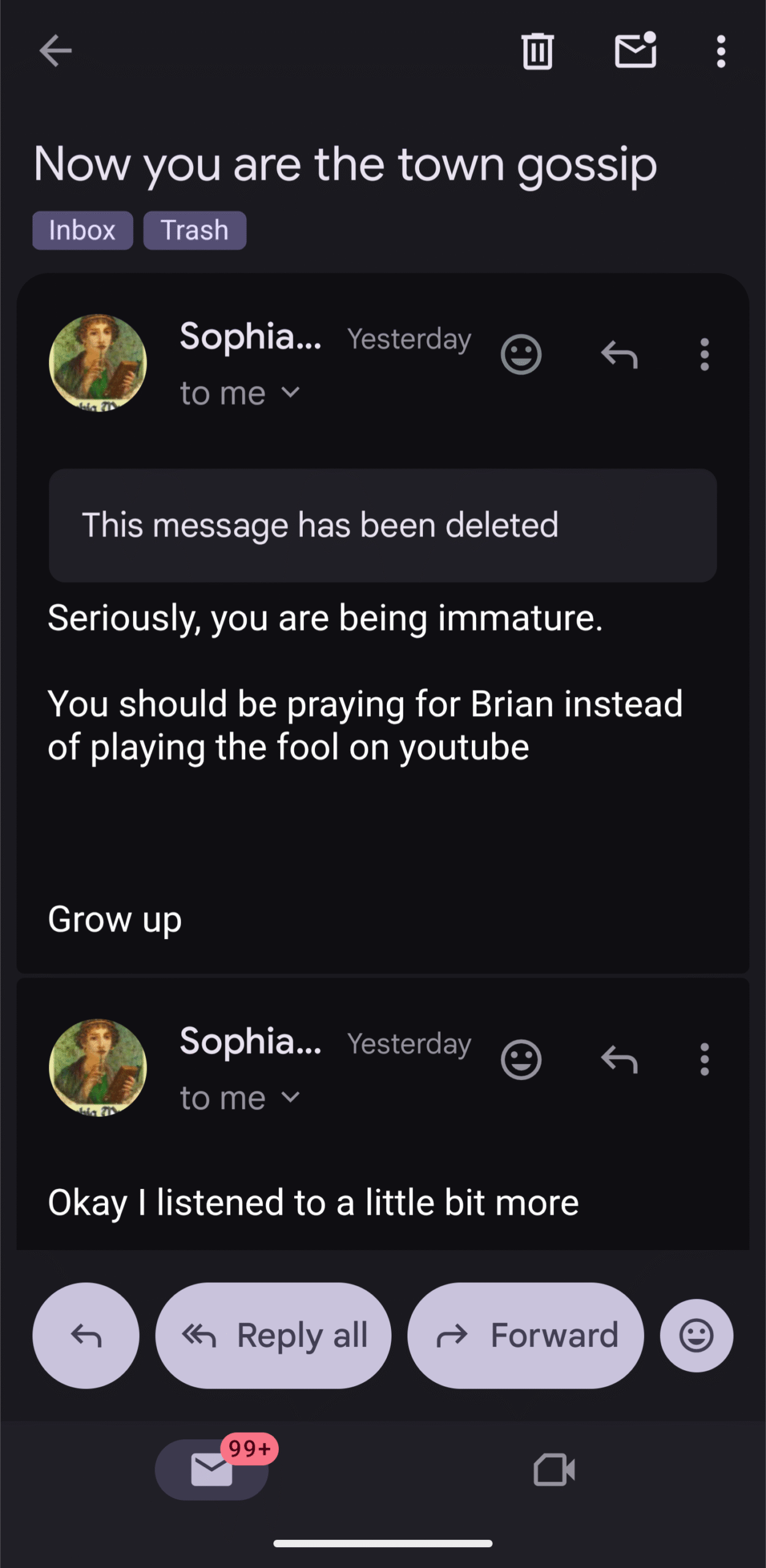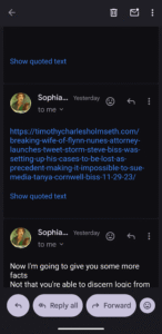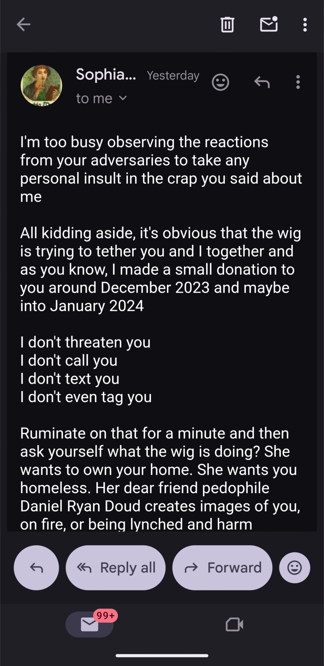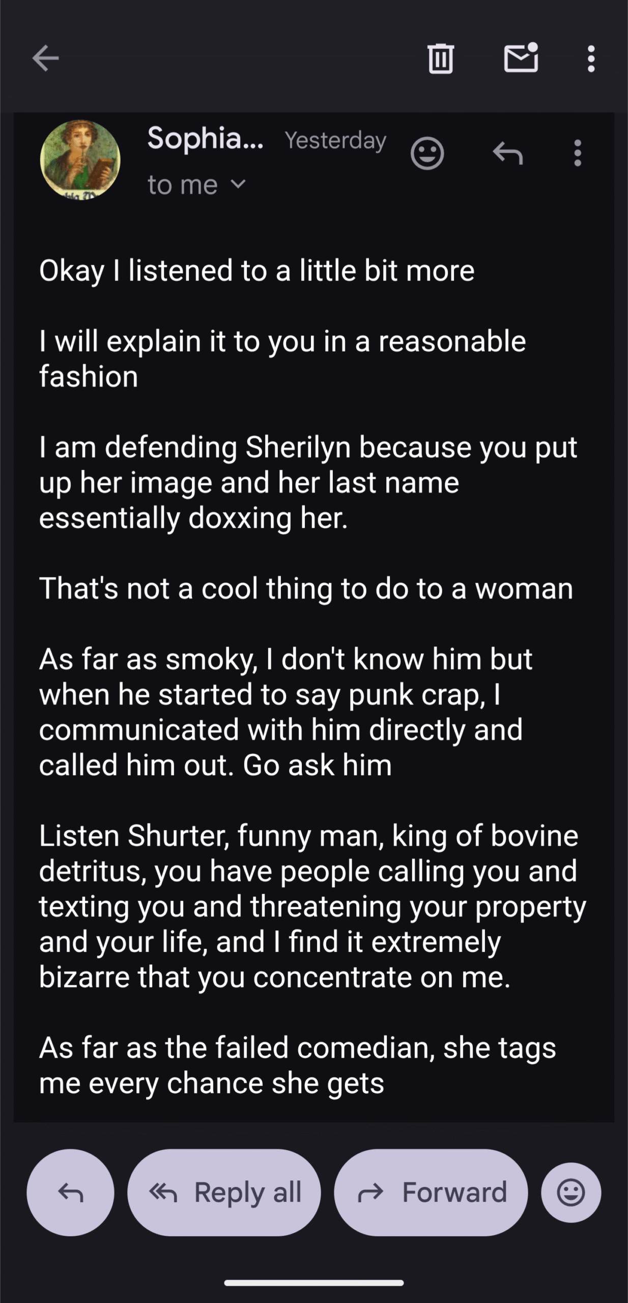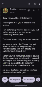 Her urging me to talk to Smokey da Clown (whose first name is Hunter) on the phone brought both Thomas Schoenberger and Gabe Hoffman to try and get me YouTube channel down after Thomas and Smokey got into an altercation in the chat of one of my videos and Thomas and Gabe claimed Smokey was MS13 and was making death threats to them.