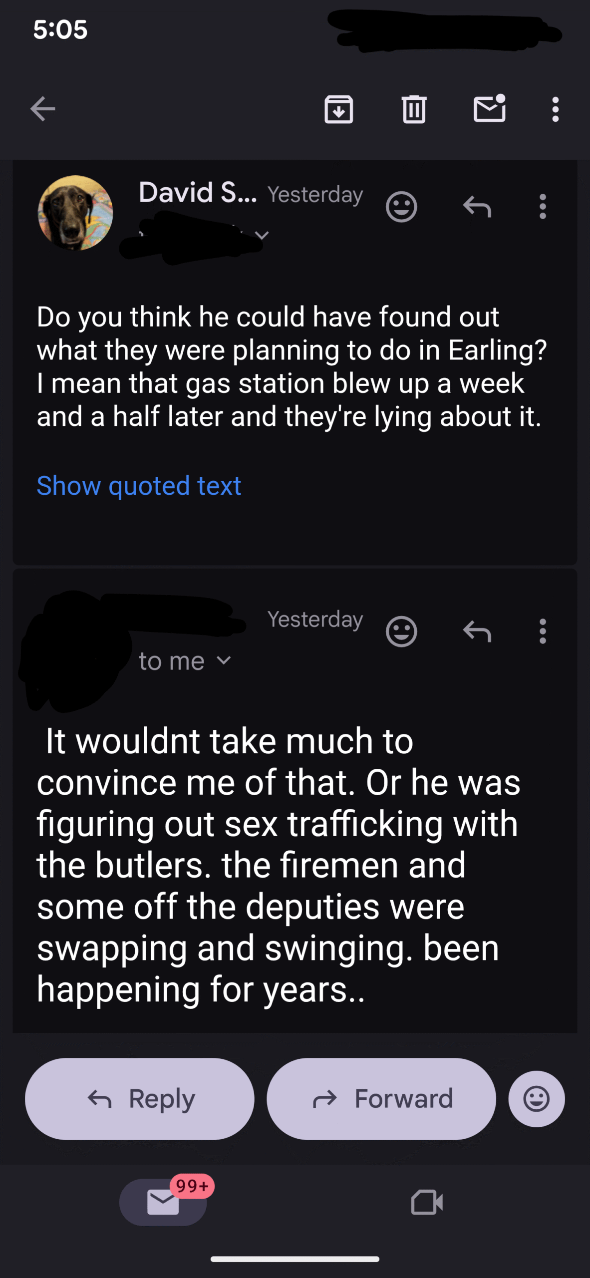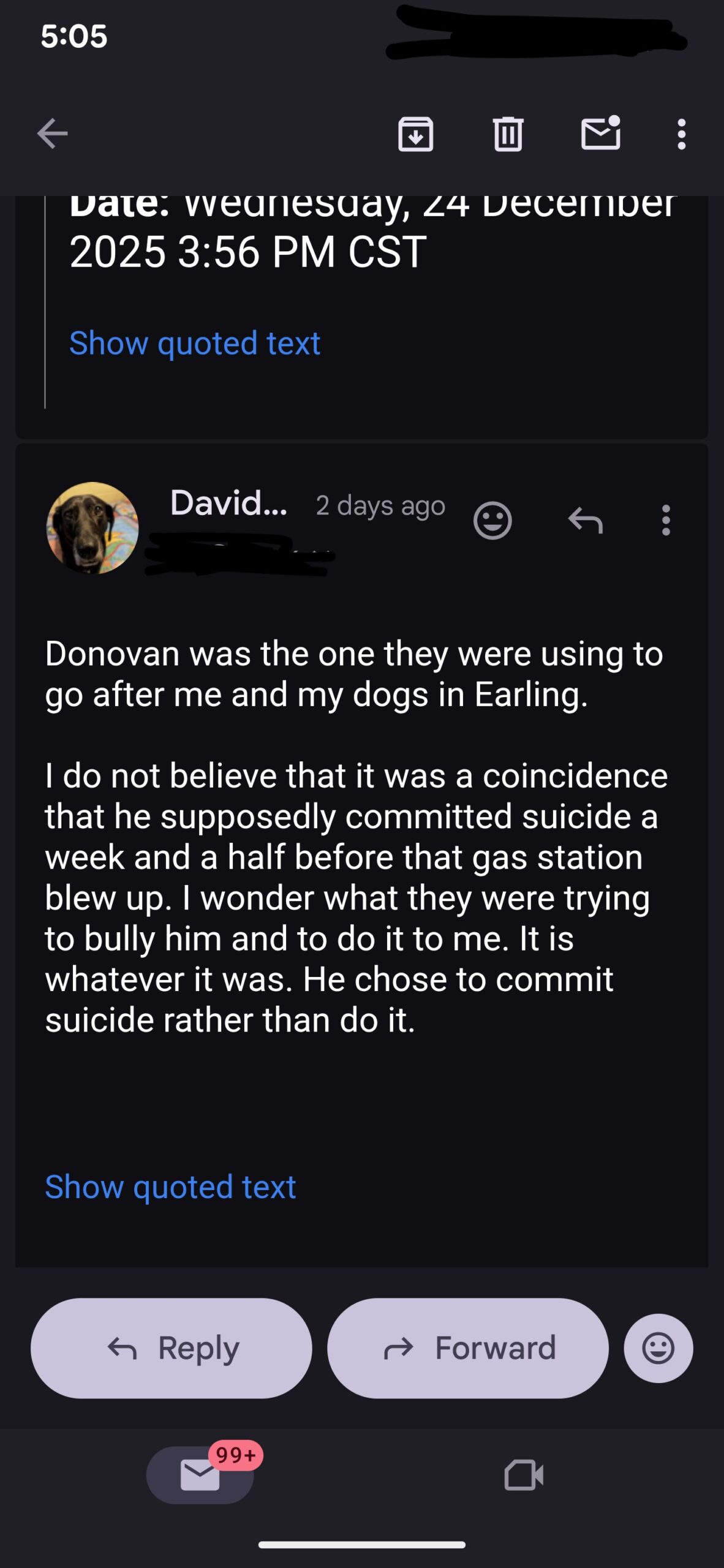 Gross helped them cover up the Earling IA gas station explosion. He helped them cover up them coming into town and murdering my friend Owen. And this is just what concerns ME! How many other crimes is he hiding that I have no connection too?