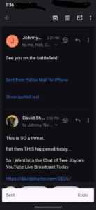 And here is the threat I received from Dougy aka Lucien Greaves founder of the Satanic Temple…