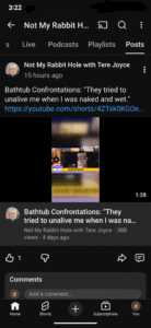 Someone sent me one of her videos where she was playing back a YouTube live video of Daniel Doud sexually harassing her, talking about how he wanted to “smell her hair” despite the fact she is married and obviously has no interest in Doud.
