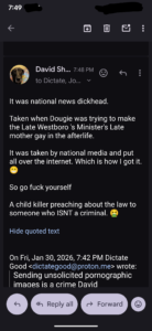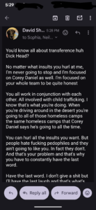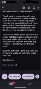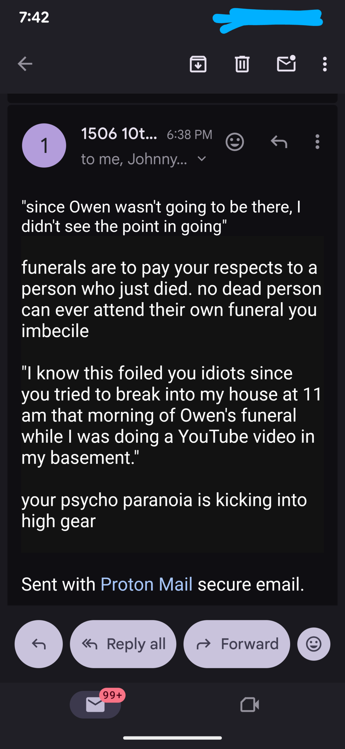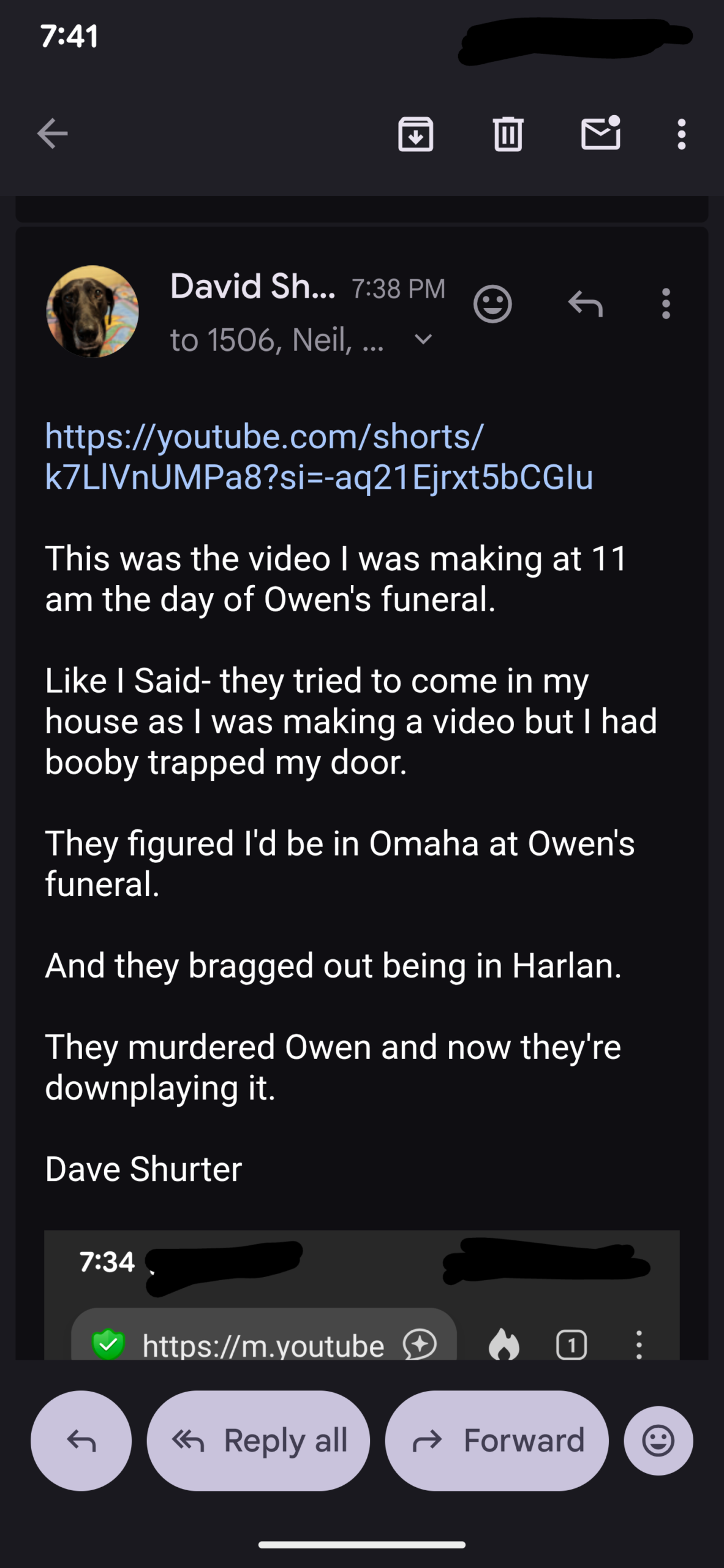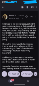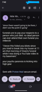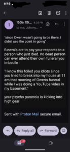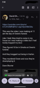 At the end of this post I’m including the argument with Daniel Doud (or maybe it’s Geo) and I’m including the YouTube short I did when they tried to come into my house during my friend Owen’s funeral.