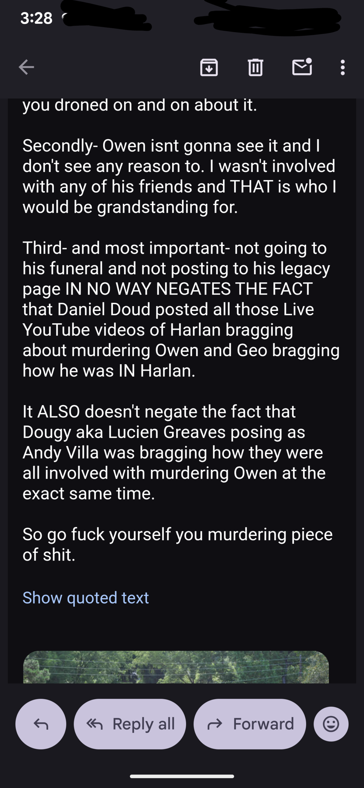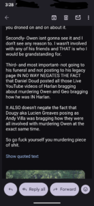 And THIS is either Daniel Doud (most likely) or Geo Farnsworth – the two who murdered my friend Owen and then bragged about it. To remind everyone- this is how it started …