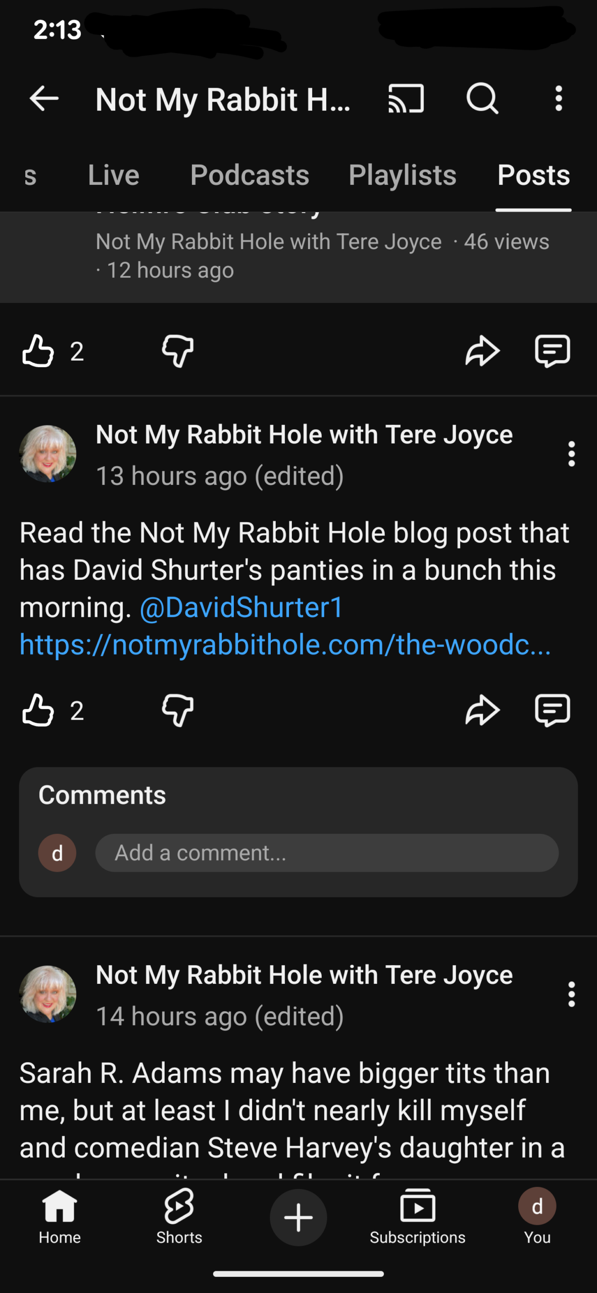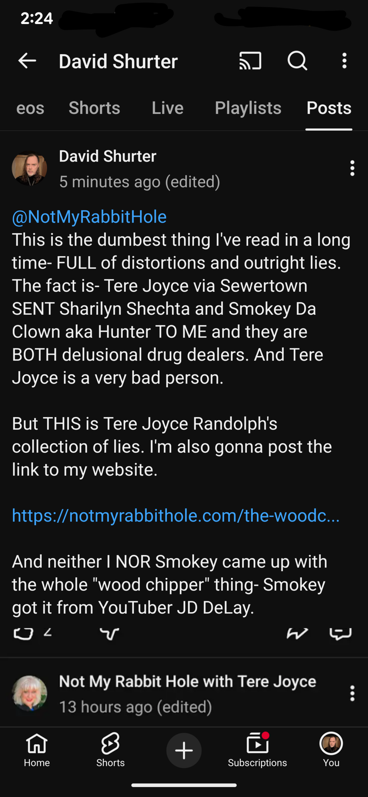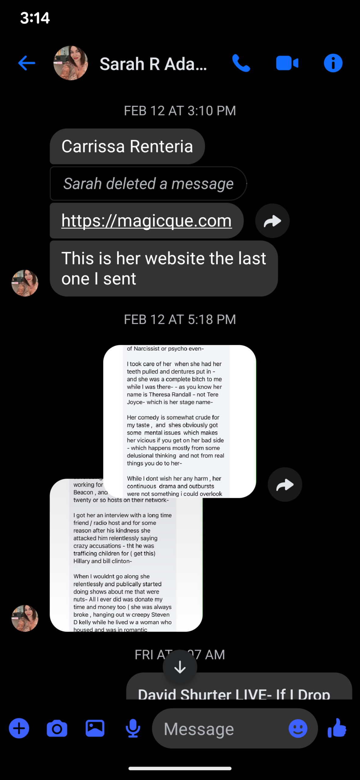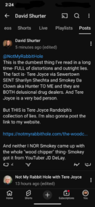Tere is desperate to make herself out to be a victim. This is the link to her bullshit. But when people wonder why I showed Sharilyn Shechta and Hunter aka Smokey da Clown the door- it’s because I realized they had been SENT to me by Tere Joyce and her Sewertown friends, which is obvious by Tere Joyce’s bs..