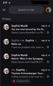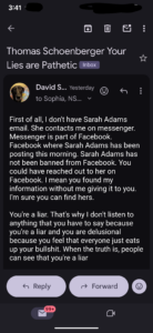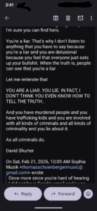 When Nathan Stolpman was first put in the hospital, he claimed he was being attacked by “Thomas Schoenberger’s ghost” which Thomas blamed on Sewertown. But Schoenberger blames EVERYTHING on EVERYONE ELSE and NEVER takes responsibility. And he doesn’t ever stop with his email attacks.