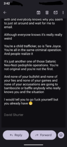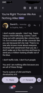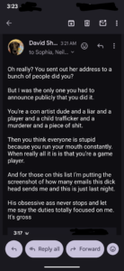 He, as they all are, are involved with child trafficking. Which I’m trying to expose and why they are so obsessively focused on me.