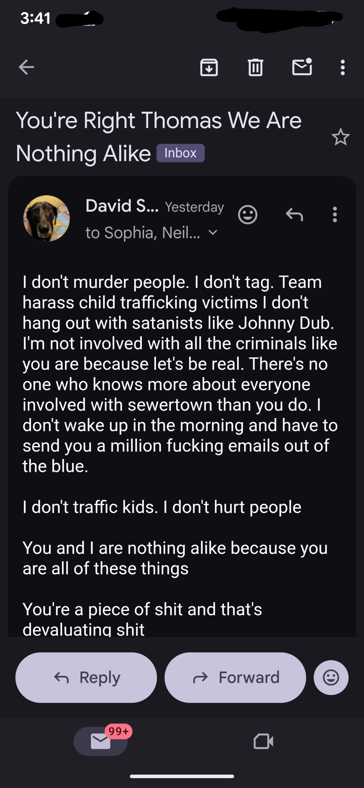 When Nathan Stolpman was first put in the hospital, he claimed he was being attacked by “Thomas Schoenberger’s ghost” which Thomas blamed on Sewertown. But Schoenberger blames EVERYTHING on EVERYONE ELSE and NEVER takes responsibility. And he doesn’t ever stop with his email attacks.