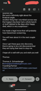 And why would I hear about the crap Thomas Schoenberger is doing to Sewertown in court actions. And how?