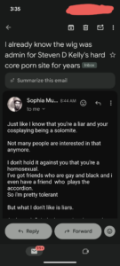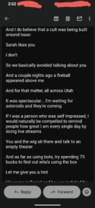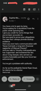 Second- I haven’t been in contact with Timothy Holmseth for YEARS- since I was in Algona, WA- and even then, after he sent me an email telling me the remains found that were supposed to be Jacob Wetterling weren’t EVEN HUMAN, our correspondence was only a handful of emails, and brief at that.