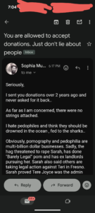 And thirdly, it is THOMAS that wants to shove Tere Joyce in my face. I haven’t seen anything she has posted in MONTHS- ever since she got me in trouble on YouTube claiming her meme with my name and my face was copyrighted by her.