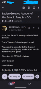 Afterwards I received THIS from Doug Mesner aka Johnny Dubb aka Lucien Greaves founder of the Satanic Temple…