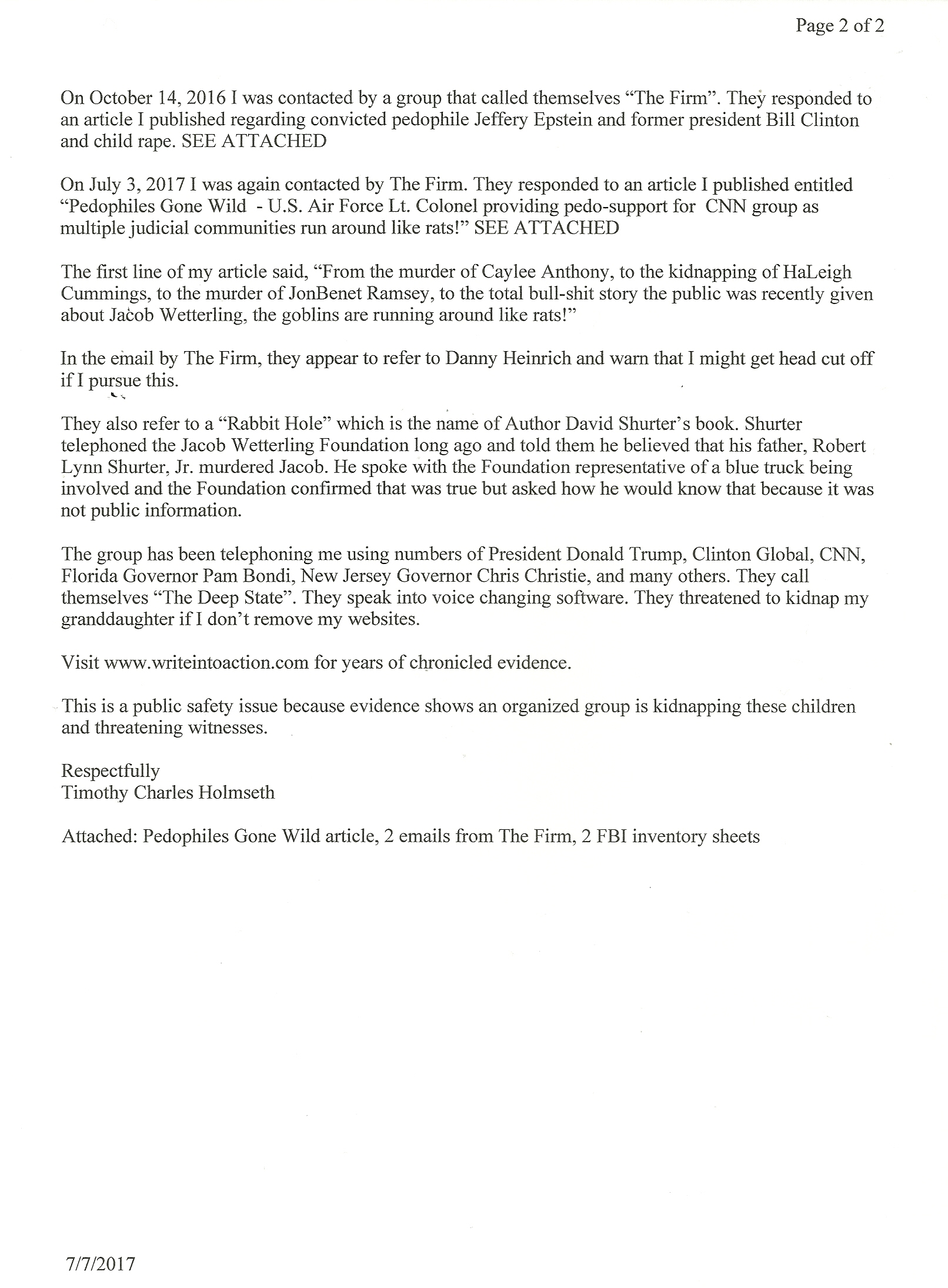On July 3, 2017 I was again contacted by The Firm. They responded to an article I published entitled “Pedophiles Gone Wild – U.S. Air Force Lt. Colonel providing pedo-support for CNN group as multiple judicial communities run around like rats!” SEE ATTACHED